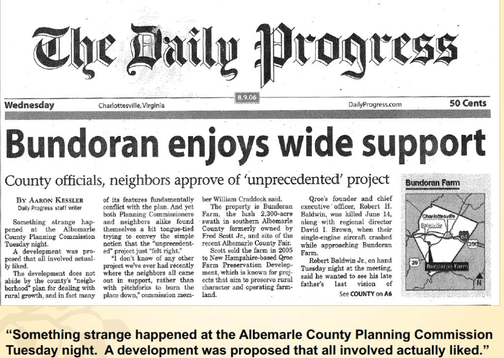 Perhaps my favorite newspaper article of all time was published the day after our public hearing with the Albemarle County Planning Commission. The Daily Progress ran the headline: “Bundoran Enjoys Wide Support,” with an opening line that read: “Something strange happened at the Albemarle County Planning Commission Tuesday night. A development was proposed that all involved actually liked.”